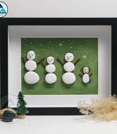 Personalized Christmas Family Pebble Art, Family Christmas Pebble Art, Custom Family with Pets, Pebble Art Gift, Snowman Family Pebble Frame